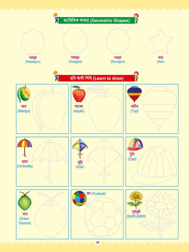 ✍️ বর্ণগুলো কীভাবে লিখতে হবে পাশাপাশি তার নির্দেশনা দেয়া আছে এবং প্রতিটি বর্ণ দিয়ে শব্দ তৈরি ও ছবি দেয়া আছে।